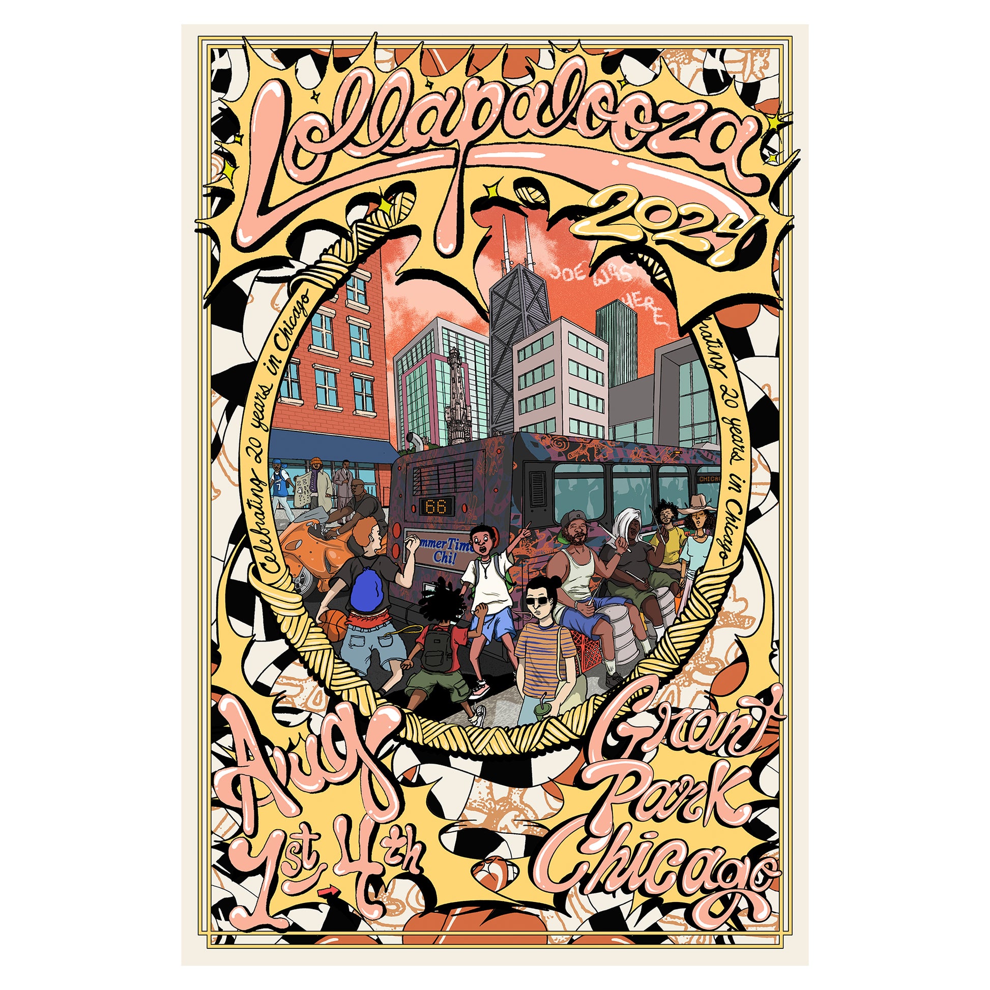 Introducing the 2024 Lollapalooza music festival poster, designed by the visionary artist Joe Freshgoods. Born and bred in Chicago, Joe captures the essence of the city through a seamless fusion of visuals, narratives, and cultural inspirations.